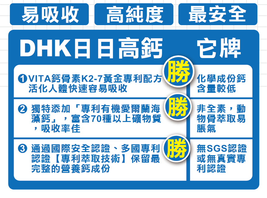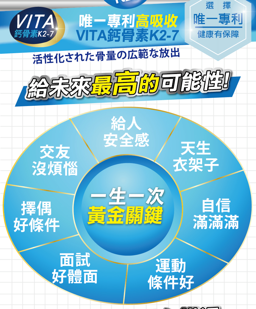 專利維他命K2-7對人體鈣質利用佔有重要關鍵地位,能正確的將鈣質帶入骨骼